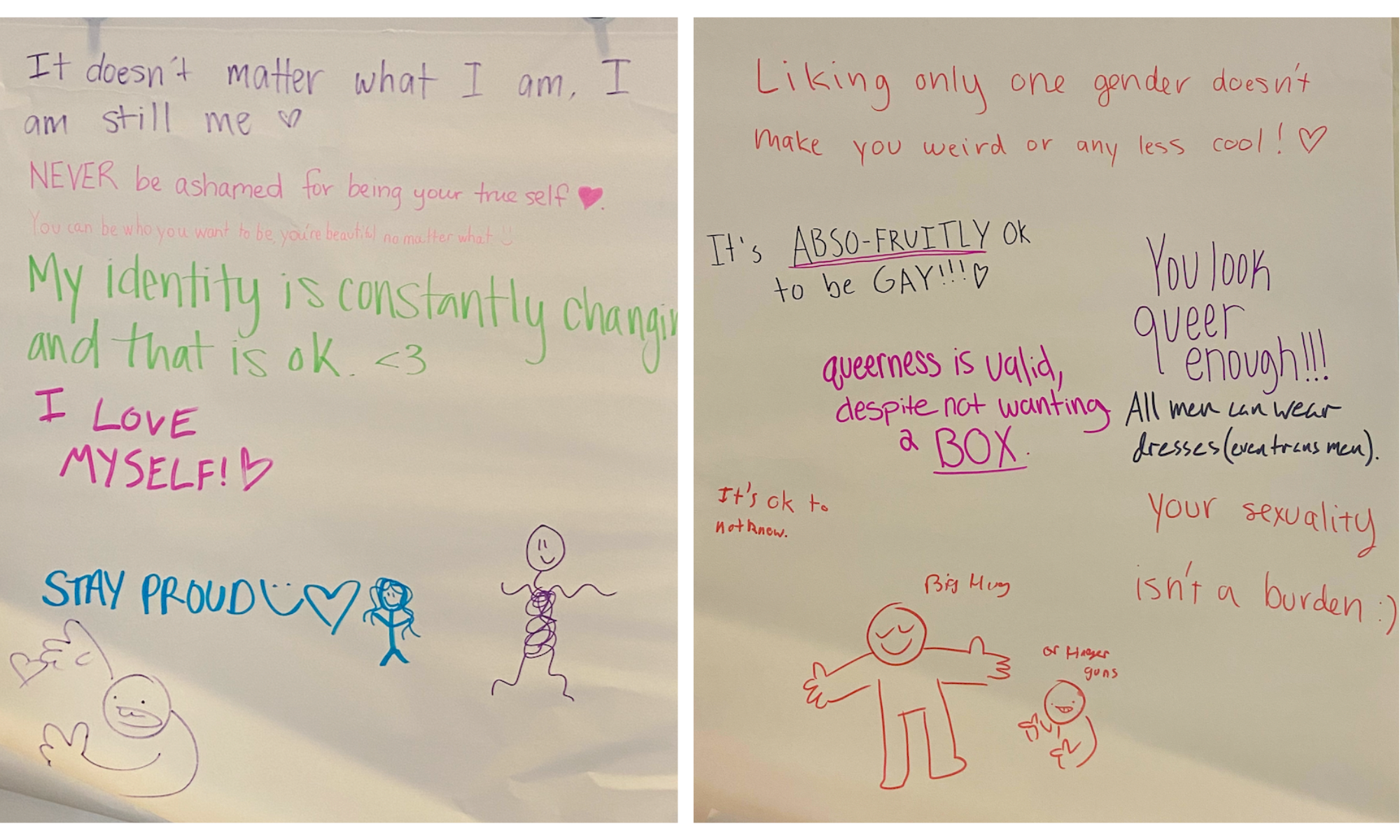 This experience showed me how important it is to assist and encourage all LGBTQ+ populations, especially youth, to feel confident in their skin and recognize that level of confidence is helpful in their mental well-being. According to The Trevor Project, 62% of LGBTQ+ youth who were enrolled in school stated that their school was LGBTQ-affirming, and these youth reported lower rates of attempting suicide. In order for young populations to feel safe to express themselves, there needs to be a support system which includes, family, friends, and safe spaces, where everyone can feel comfortable to express themselves and be seen within their community.